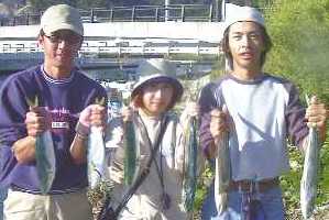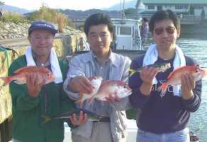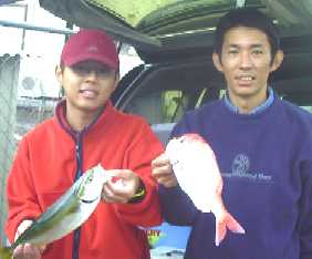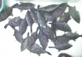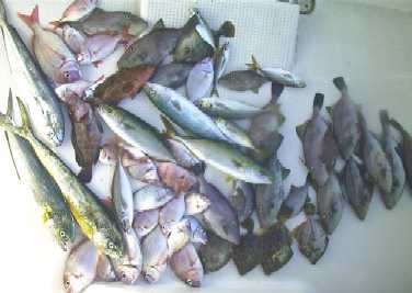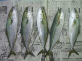 ・岐阜県-シミズさん他2人と立石沖で五目釣りに釣行 ・天候は快晴、波・風ともになし ・アジ(20cm〜30cm)70匹、メンカ〔小鯛〕(15cm〜25cm)20匹、カワハギ(20〜28cmcm)15匹、ハマチ(38cm)1匹、サバ(25cm前後)5匹、レンコンダイ(28cm〜33cm)5匹 ・ホームページ開設して以来、最多の釣果 ・アジ、1度にサビキに5匹釣れることも・・・爆釣!!! ・メンカも35cm3匹、型・数ともに絶好調! ・天気も良く、最高の釣り日和でした ・釣果の写真はホームページトップに掲載中 |