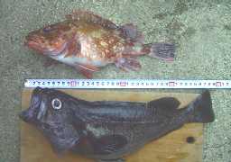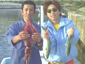 ・敦賀市のゲンさんと2人で立石沖へアジ釣りに釣行 ・天候は晴れ後曇り、風・波は少々有り ・アジ(23cm〜27cm)32匹、カサゴ(30cm)ソイ(40cm)各1匹の釣果 ・太平洋側で良く使用されている赤タン(イカの切り身を食紅で染めた物)を自分で作り、使用した。アジの食いつきもまずまずで、エサが取られにくいのが良い。また、左写真のような外道もうれしい。 |