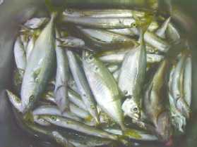 ・妻と2人で大谷前にてアジ釣り。 ・天候は晴れ時々曇り、風・波はまったくなし。 ・アジ(10cm〜25cm)35匹の釣果。 ・はじめ湾内で釣っていたが、数が釣れず、大谷へ。大谷では15cm前後入れ食い。サビキ針6本すべてに釣れた時にはビックリ! ・日差しが強いため、早めの帰港。約3時間の釣果です。 ・最近は風・波とも弱い時が多くなりました。沖に行けば必ず釣れると思います。後は日差しとの我慢くらべです。 |