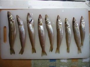 ・1人で敦賀湾内にてキス釣りに釣行 ・天候は曇り時々雨、風・波はあまりなし ・キス(20cm〜15cm)9匹の釣果 ・前日(14日)及び今日(15日)クラブ活動日だったが天候が悪いため中止 ・特に前日は出港したのだが、立石沖についたとたん、強風が吹き荒れ、あえなく仕掛けをおろすことなく、帰港となった ・「釣りたい・釣りたい」が我慢できずに1人で行ってきました ・途中雨が降ってきたので1時間30分ぐらいの釣果です ・尺アジ釣れているみたいです。天候さえ良ければ・・・ |