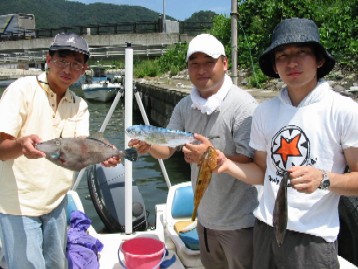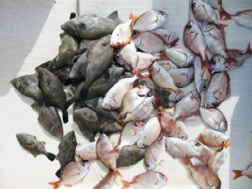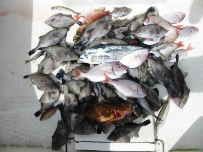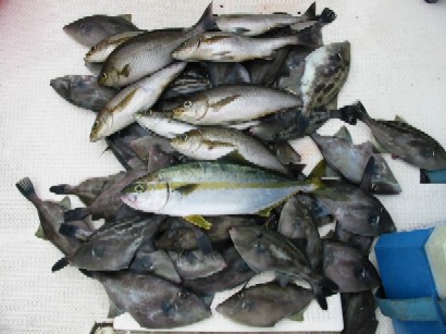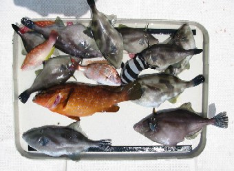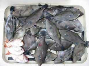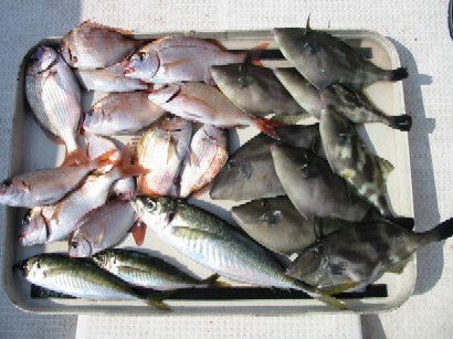 ・林さんらと3人で敦賀湾沖にて五目釣りに釣行 ・天候は晴れ、風・波はなし。最高の釣り日和 ・メンカ、レンコダイ(27cm〜20cm)65匹、カワハギ(32cm〜25cm)50匹の釣果。 ・林さんの友人は船釣が初めてということで、五目釣りに初挑戦。 やみ間なしに釣れ、クーラボックス満タンで満足げでした。 ・ポイントを4箇所変更したが、いずれもメンカとカワハギばかり。アジやハマチはどこにいるのかな・・・? ・初めてメンカで鯛めしを作り食べましたが、鯛の風味と塩味が良く、すごくおいしかったですよ |