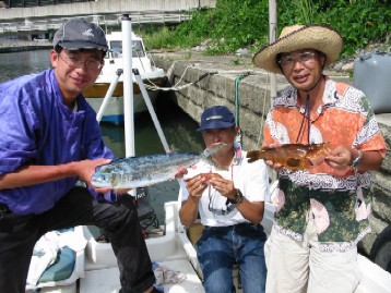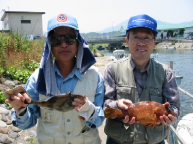 ・元山さん、岡田さんと3人で敦賀湾沖にてアジ釣りに釣行 ・天候は晴れ、風・波はなく、最高の天候! ・アコウ(38cm)1匹、カワハギ(30cm前後)10匹、その他の釣果 ・久々に天候は良かったが、釣果が伸びず残念 ・アジが1匹も釣れなく、どこに行ったのか・・・? ・アコウとは別名キジハタ・アズキマス・アカラと地方によって名前が異なります。高級魚で、魚屋でもあまり見かけません。特に今回の38cmは、でかかった! |