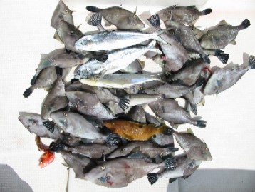 ・灘さんと2人で敦賀湾沖にて五目&フカセに釣行 ・天候は曇り、風・波は結構あり。大きなうねりがあった ・カワハギ(35cm〜25cm)25匹、メンカ(25cm)3匹の釣果。 ・完全フカセで大物を狙いに沖には出たものの、強風と大波により断念 ・五目ではカワハギばかり。入食いでたくさん釣れます。 |