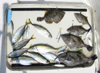 ・横山さんと2人で敦賀湾沖にてアジ釣りに釣行 ・天候は曇り、風・波は無し。暑くも無く最高の釣り日和 ・アジ(28cm〜20cm)18匹、カワハギ(34cm〜25cm)35匹、マトウダイ(43cm)1匹、アコウ(35cm、38cm)の釣果。 ・今年初の爆釣!!! ・アジは30分間入食い。25cmサイズが4匹連なって釣れることも ・カワハギは専用引っ掛けで爆釣 ・マトウダイは子アジの泳がせ釣りでの釣果 ・今後が楽しみです |