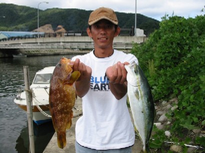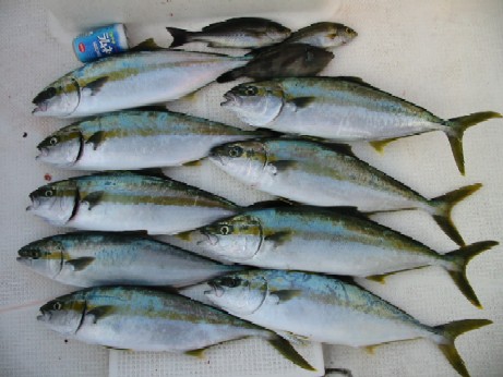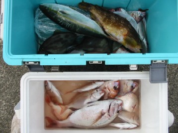 ・林さんと2人で敦賀湾沖にてフカセ釣りに釣行 ・天候は快晴、風・波はなし。最高の釣り日和 ・ワラサ(68cm〜62cm)9匹、カワハギ、イサキの釣果。 ・ワラサの引きは過去最高! ・ドラグを調整しながら、魚とのやりとりがおもしろい。 ・上記釣果のほか、バラシ多数あり。6号のハリスが切れてしまいます ・ワラサは刺身で食べましたが、脂がのっており、うまい!! ・今後も天候さえ良ければ、大物の釣れる可能性”大” |