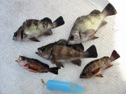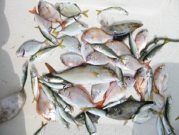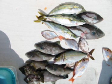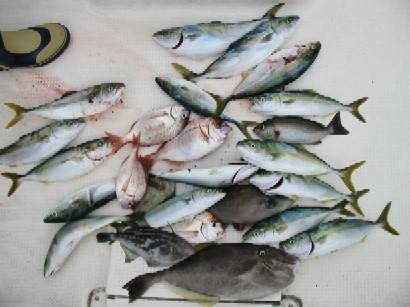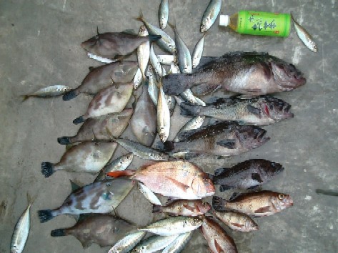 ・カンパチ(40cm)1匹 ・カワハギ(20cm前後)2匹 ・メンカ 、レンコダイ(20cm前後)15匹 ・メッキ(20cm前後)6匹 ・アジ(23cm〜15cm)25匹 ・アオリイカ:1匹 |
