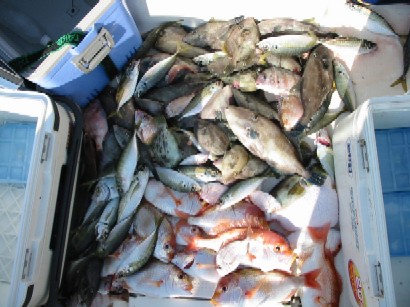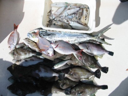 ・アオリイカ(20cm前後)10パイ ・カワハギ(30cm〜25cm)20匹 ・メンカ 〔チダイ〕(22cm〜15)5匹 ・シイラ(55cm)1匹 |