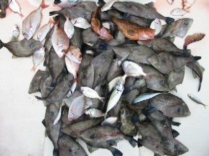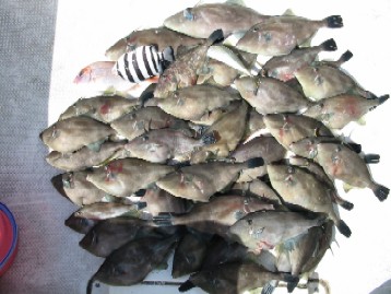 ・カワハギ(33cm〜25cm)62匹 ・メンカ 〔チダイ〕(25cm〜15)20匹 ・アカラ〔アコウ〕(28cm)2匹 ・アジ少々 |