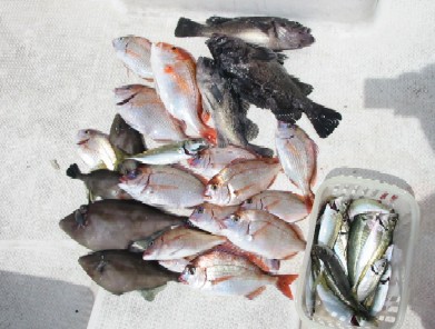 ・マダイ(35cm)1匹 ・ソイ(42cm〜28cm)4匹 ・アジ(25p〜15cm)27匹 ・メバル(25cm〜15cm)4匹 ・カワハギ(30cm〜22cm)8匹 |