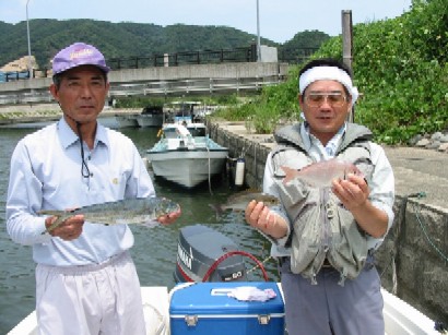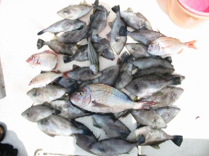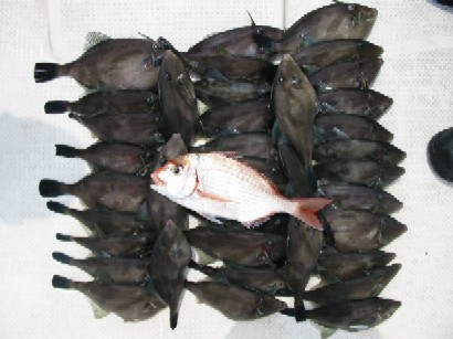 ・マダイ(43cm)1匹 ・カワハギ(32cm〜25cm)35匹 ・メンカ 〔チダイ〕(25cm)3匹 ・イサキ(23cm)2匹 |